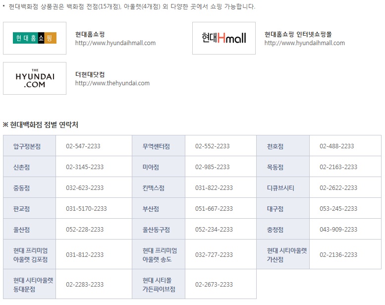 • 현대상품권은 바겐세일과 같은 가격할인 기간을 포함하여 언제든지 사용하실수 있습니다.
